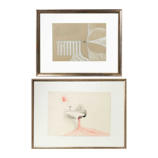 Zwei Zeichnungen in Buntstift bzw. Tusche auf Papier bzw. Karton.