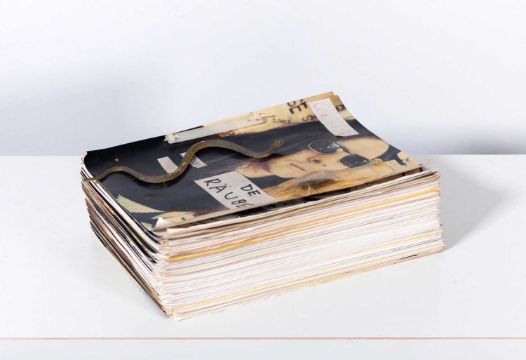 Jonathan Meese (1970 Tokio – lebt in Berlin) Die Monosau. Clan of Clan. De Räuber. 1995/1996.Künstlerbuch mit Original-Zeichnungen, Original-Farbfotografien auf Agfa, Schwarz-Weiß Kopien und Manuskripten, u.a. von Das Urgold, Prolog, Die Monosau. Mit Plastiktieren und Klebeband collagiert. Mit Plastikbindung. Maß: 30 x 22 x 9 cm, ca. 600 Seiten. Wir danken dem Evolutionsbureau Jonathan Meese, Berlin, für freundliche Auskunft.Zustand: Angestaubt, Plastikbindung gebrochen, Plastiktiere und Klebeband spröde.Provenienz:Sammlung Claus Boje.Angaben zum Werk:Das Künstlerbuch enthält ein Manuskript der Monosau, dem "Episodenroman on the Rocks". Der Künstler kompilierte in seinen Künstlerheften Photokopien, überwiegend deutschsprachige, aber auch einige englische Texte, zumeist in Form von Typoskripten. Die handschriftlichen Texte hatte Brigitte Meese, die Mutter des Künstlers, minutiös abgetippt. Photographien von Stefan Thater, die Meese in seinen frühen Installationen zeigen, sind eingebunden. Zehn dieser Buchdummies hatte Meese an renommierte deutschsprachige Literaturverlage versendet. Nach durchweg ablehnenden Antworten widmete er den Dummy zum Buchobjekt um. Meese plante, die Literaturgattung Roman zu revolutionieren - und hat ein Künstlerbuch entworfen.