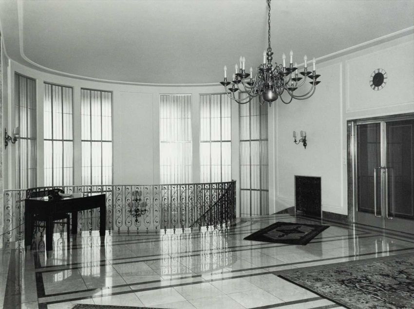 Ursula Edelmann (1926 Berlin – lebt in Frankfurt am Main) Deutsche Genossenschaftskasse. 1950. Bromsilbergelatine-Abzug auf Barytpapier. Verso von fremder Hand bezeichnet, betitelt, datiert und nummeriert: Ursula Edelmann, Deutsche Genossenschaftskasse, ca. 1950, I/1. Bildmaß: 29 x 39,5 cm. Rahmenmaß: 63 x 52 cm. Provenienz:Privatsammlung, Deutschland.