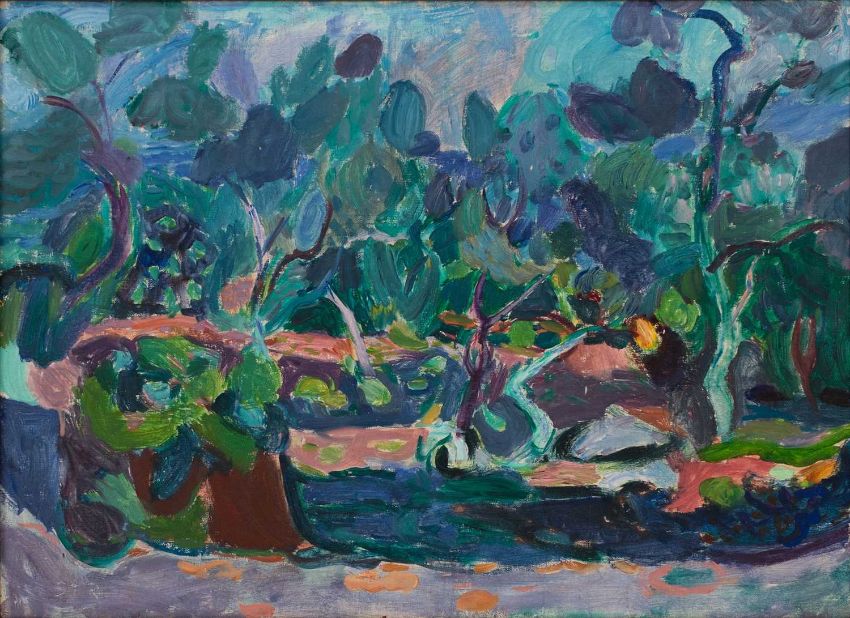Oliven und Feigenbäume vor dem Meer. Um 1955.