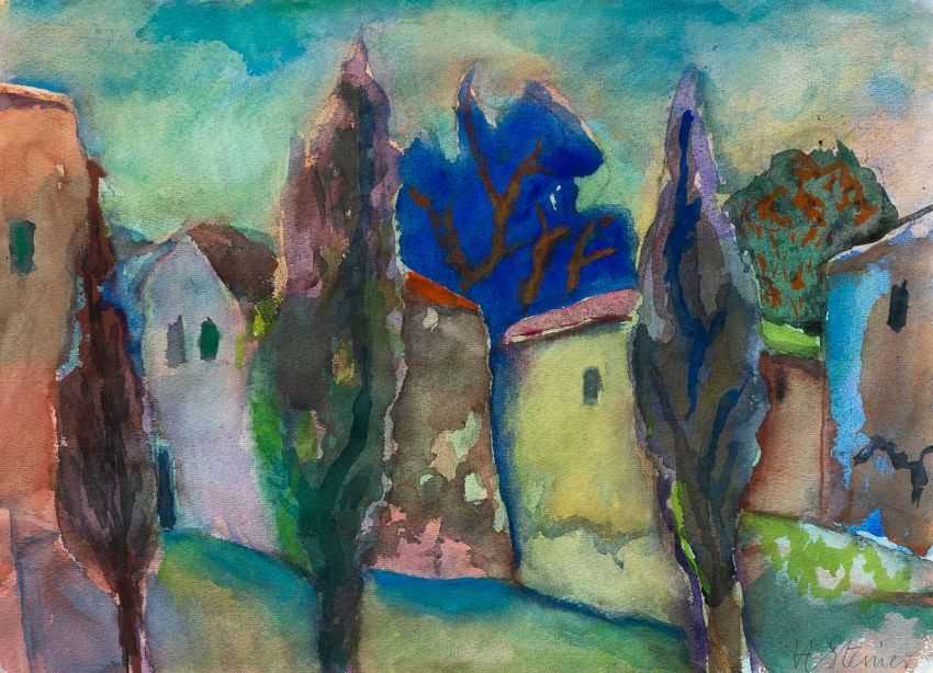 Am unteren Blattrand mit Bleistift signiert: H. Steiner. Sowie verso betitelt: Stille Dorfstraße.