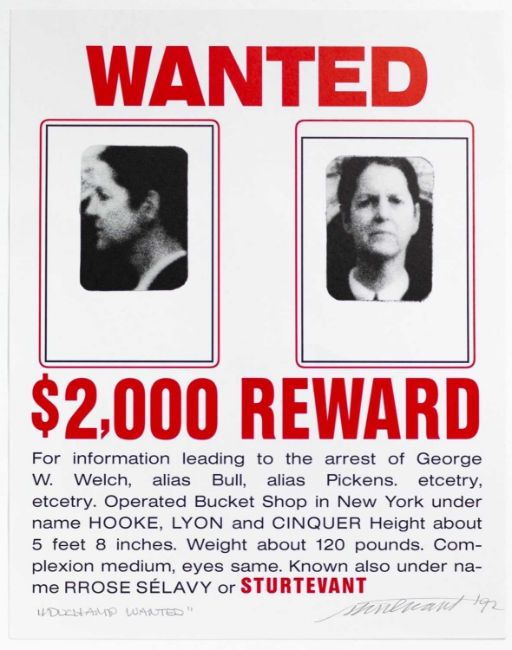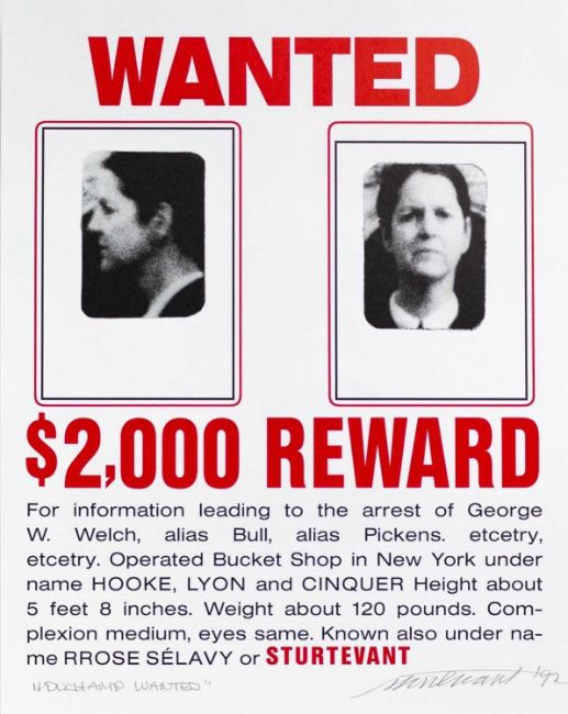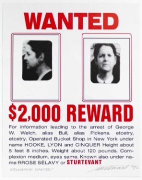 Elaine Sturtevant (1924 Lakewood - Paris 2014) Duchamp wanted. 1992. Offsetdruck auf Karton. Am unteren Blattmaß mit Bleistift signiert, betitelt und datiert: "Duchamp wanted", Sturtevant, '92. Aus einer Auflage von 50 Exemplaren, davon 10 realisiert. Blattmaß: 32,8 x 26 cm. Provenienz:Privatsammlung, Deutschland Angaben zur Künstlerin: „Sturtevant schuf etwas Neues aus etwas, das nicht neu zu sein schien. Damit zwang sie uns, darüber nachzudenken, was Fortschritt bedeutet. Sie wollte nicht, dass wir eines ihrer Werke für einen Jasper Johns halten. Sie wollte uns vielmehr den Blick unter die Oberfläche der Kunst eröffnen, auf das, was sie die verborgene Bausubstanz, das lautlose Innere der Kunst nannte. Damit meinte sie die Art, wie Kunst gemacht wird, wie sie zirkuliert und wie sie schließlich kanonisiert wird.“