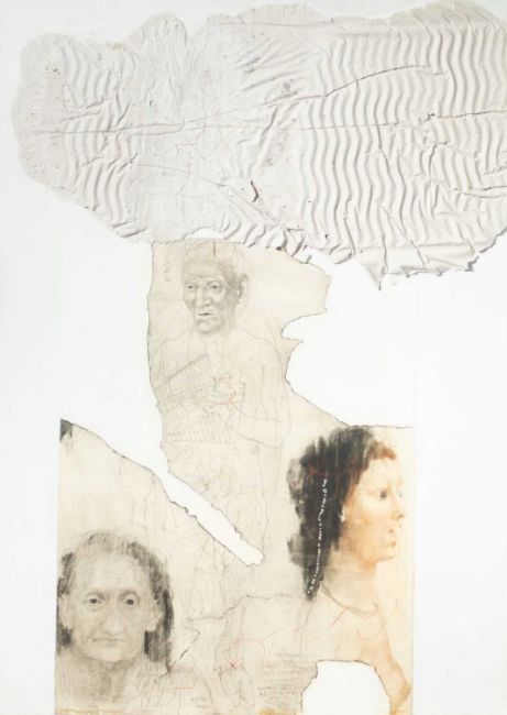 Collage, Gips, Kaltnadelradierung und Tusche auf Velin und Spanplatte collagiert.