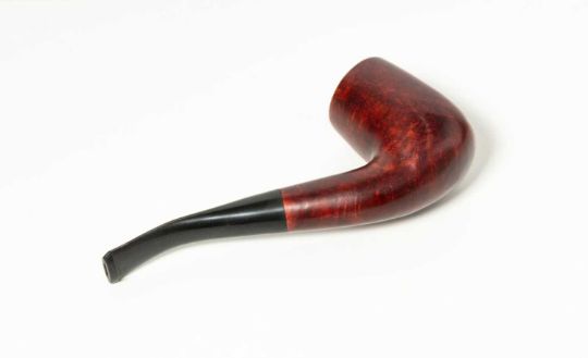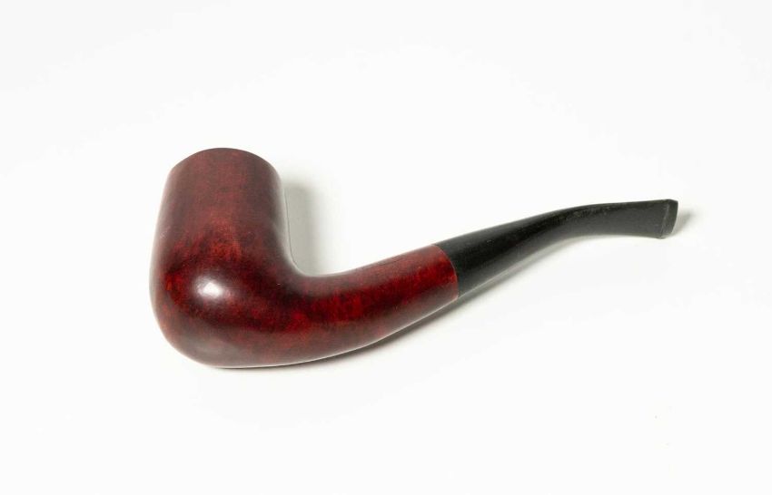 Pfeife in Holzkasten. Im Innendeckel verkleinerte, bearbeitete Farbfoto-Reproduktion eines Gemäldes von René Magritte.