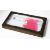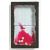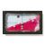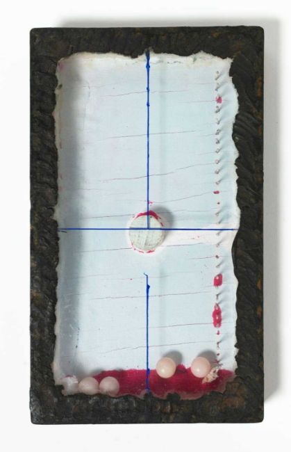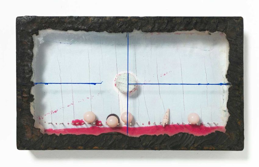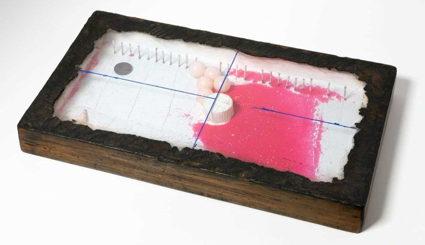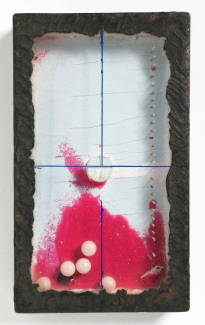 Mit Glasscheibe verschlossener, bemalter Holzkasten. Darin mit Nägeln, 5 losen rosafarbenen Plastikbällen, rosafarbener Sand, Münze, Holz.