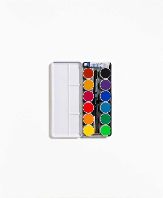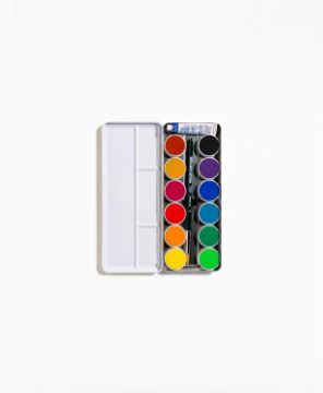 Deckfarbenkasten "Pelikan 735/12", aufgeklappt, auf weiß gestrichener Leinwand montiert.