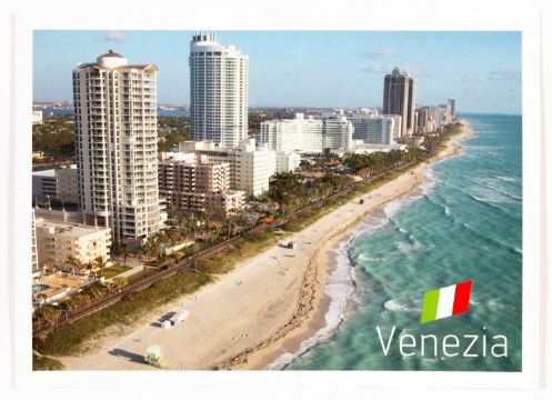 Angaben zum Werk: "In each of her 100 postcard designs, Mir pairs the designation 'Venezia,' with appropriated images of tourist destinations from around the world. However, none of the postcard images actually depict Venice. The locations vary widely, featuring tropical and snow-covered climates, cityscapes and miscellaneous natural wonders. At times, well-known landmarks such as the Ponte Vecchio in Florence and the Chateau de Chambord in France are attributed to Venezia." (– Kelly Nosari)