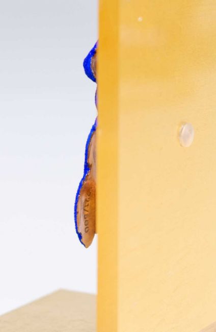 International Klein Blue (IKB) Pigment auf Bronze (Brosche), befestigt auf mit Blattgold bearbeitetem Plexiglas-Ständer.
