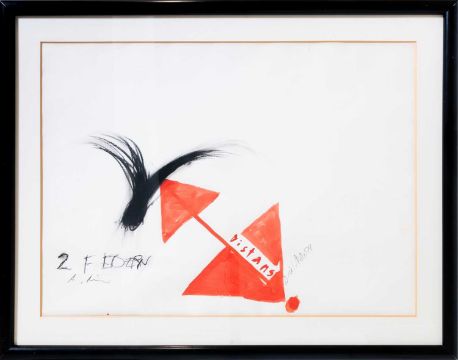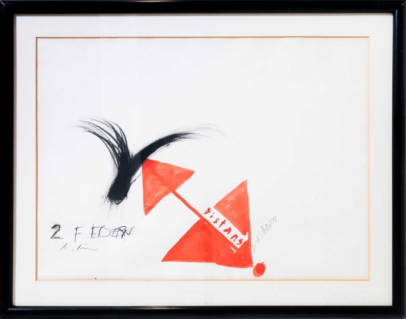 Innerhalb der Darstellung mit schwarzem Stift bzw. Gouache signiert, betitelt und datiert: A. Rainer, 2 Federn/Dieter Roth, Distans, 74.
