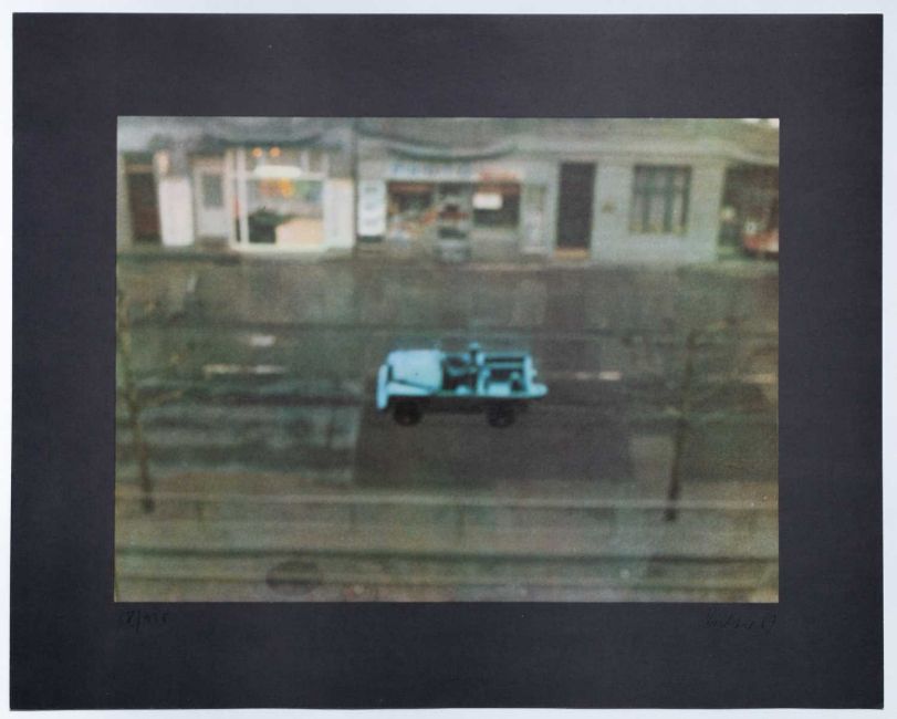 1969 produzierte Richter ein visuell rätselhaftes Blatt: Der Offsetdruck ‘Auto’ zeigt eine schräg von oben aufgenommene Straße, auf der ein offener Jeep fährt. Das Motiv ist leicht verschwommen und somit nur undeutlich zu erkennen, wobei der Wagen seltsam modellhaft wirkt und über der Straße zu schweben scheint. Mit unscharf eingestelltem Kameraobjektiv fotografierte der Künstler durch eine Fensterscheibe, auf die er vorher ein kleines Spielzeugauto montiert hatte. Für den fotografischen Blick scheint dieses Auto somit auf der vor dem Fenster befindlichen Straße zu fahren. Die für den Jeep künstlich erzeugte und irreale Umgebung verhilft ihm zu illusionärer Größe. Der Wagen behält als visuelle Erscheinung jedoch trotzdem seinen modellhaften und irritierend schwebenden Charakter, wobei er seine Identität als Spielzeug im Bild nicht preisgibt. (Butin 2004, S. 37)