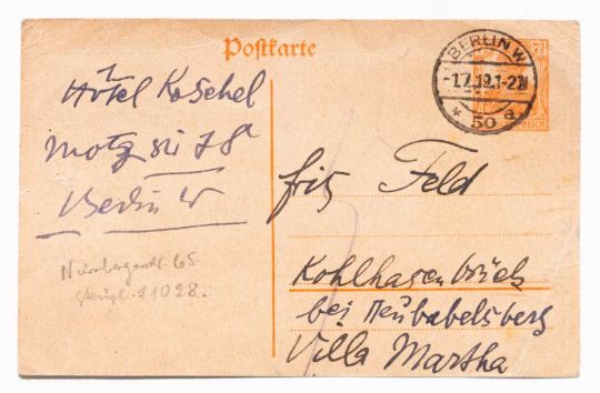 1919 schreibt Else Lasker-Schüler an den jüdischen Schauspieler Fritz Feld: "Lieber Fritz Feld. Ich war sehr (?) kurz im Café aber nur immer aus Müdigkeit. Wann und wo ist Ihre Premiere? Ich grüße Sie viele Male. Ihre Else-Lasker Schüler."