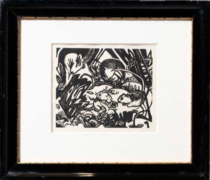 Franz Marc (1880 München - Braquis 1916) Tierlegende. 1912/1919-1921. Holzschnitt auf Bütten. Verso mit typografischen Angaben. Blattmaß: 25,5 x 35,5 cm. Unter Passepartout und Glas gerahmt: 44 x 51,3 cm. Hrsg. von: Kurt Wolff Verlag, München. WVZ.: Hoberg/Jansen 23, 3rd Edition. Provenienz:Privatsammlung, Nordrhein-Westfalen. Vorbesichtigung: Droysenstraße 13, 10629 Berlin.
