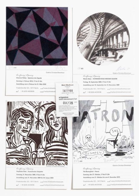 17 Einladungskarten der Galerie Christian Ehrentraut, Berlin, mit verschiedenen Grafiken. Unter anderem von: Andreas Blank, Franziska Holstein, Yudi Noor, Tilo Baumgärtel und Anan Tzuckerman.