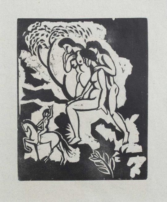 August Macke (1887 Meschede - Champagne 1914) Begrüßung. 1912. Linolschnitt auf grauem Bütten. Blattmaß: 46,5 x 30,5 cm. Unter Passepartout und Glas gerahmt: 57,5 x 49,5 cm. Verso mit Bleistift von fremder Hand bezeichnet: August Macke, Begrüßung, 1912. Provenienz:Privatsammlung, Nordrhein-Westfalen. Vorbesichtigung: Droysenstraße 13, 10629 Berlin.