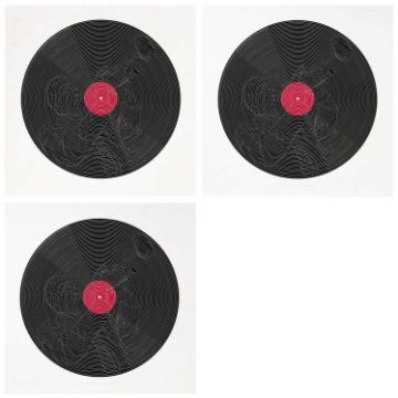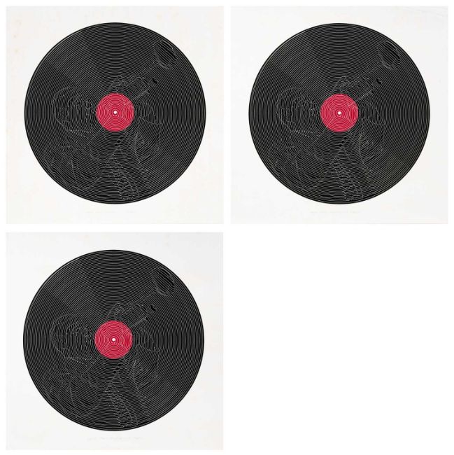Thomas Bayrle (1937 Berlin – lebt in Frankfurt) Louis Armstrong L. P. 1973. Drei Farbserigrafien, jeweils auf leichtem Karton. Jeweils unterhalb der Darstellung mit Bleistift signiert, betitelt, datiert und nummeriert: Bayrle, Louis Armstrong L.P., 73, 71/100 bzw. 75/100, bzw. Probe 4/5. Blattmaß jeweils: 70 x 70 cm. Zustand: Zwei der Blätter leicht fleckig. Provenienz:Privatsammlung, Berlin. Vorbesichtigung: Lise-Meitner-Straße 7-9, 10589 Berlin.