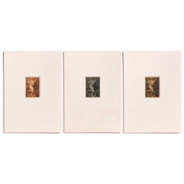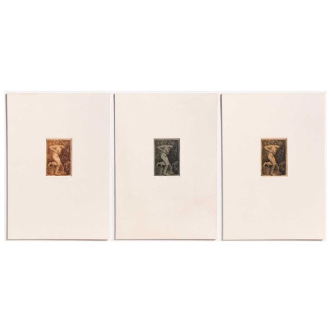 Max Klinger (1857 Leipzig - Großjena 1920) Ex Libris Dr. med. C. Schirren. Drei Kupferstiche in unterschiedlichen Farben, auf verschiedenfarbigen Bütten. Jeweils Passepartout-Ausschnitt: 13,5 x 9,2 cm. Jeweils unter Passepartout montiert: 50 x 35 cm. Provenienz:Privatsammlung, Nordrhein-Westfalen. Zur Vorbesichtigung in der Lise-Meitner-Str. 7-9, 10589 Berlin.