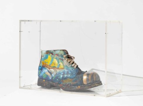 Schuh mit Farbe in Plexiglasbox.