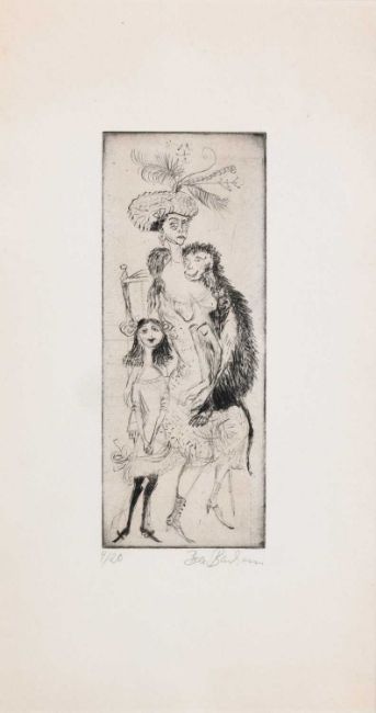 Bele Bachem (1916 Düsseldorf - München 2005) Familie mit Affe. Radierung auf Velin. Unterhalb der Darstellung mit Bleistift signiert und nummeriert: Bele Bachem, 4/20. Blattmaß: 45 x 26 cm. Unter Glas gerahmt: 46,5 x 27,5 cm. Provenienz:Privatsammlung, Berlin. Angaben zur Künstlerin: Bele Bachem gilt als eine der bedeutendsten deutschen Nachkriegskünstlerinnen. Sie war ebenfalls Bühnenbildnerin und Zeichnerin. Oft wird sie als surrealistische Malerin beschrieben, wollte sich selbst allerdings nicht als solche verstehen. Im Krieg wurden ihr von den Nationalsozialisten Ausstellungen untersagt. Zur Vorbesichtigung in der Droysenstr. 13, 10629 Berlin.