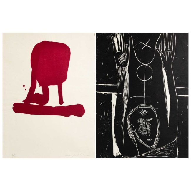 Mimmo Paladino (1948 Paduli – lebt in Mailand) Carro dormente (aus: Mappenwerk. Für Joseph Beuys). 1987. Holzschnitt und Farblithografie, jeweils auf Hosokawa-Japanpapier. In einem mit Farblinolschnitt bedruckten Umschlag aus Arches Bütten. Im Original-Schutzumschlag. Am unteren Blattrand des Holzschnitts mit Bleistift signiert und nummeriert: Mimmo Paladino, 87/90. Blattmaß jeweils: 80 x 60 cm. Maße Mappe: 80,5 x 60,5 cm. Hrsg. von: Edition Galerie Bernd Klüser/Edition Schellmann, München/New York. Provenienz:Privatsammlung, Berlin. Zur Vorbesichtigung in der Lise-Meitner-Str. 7-9, 10589 Berlin.
