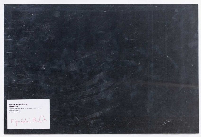 Verso auf einem Etikett mit rotem Fineliner signiert, typografisch betitelt, datiert and nummeriert: Pipilotti Rist, Sonnenaufgang im Land der untergehenden Sonne, 1999/2002, 93/100.