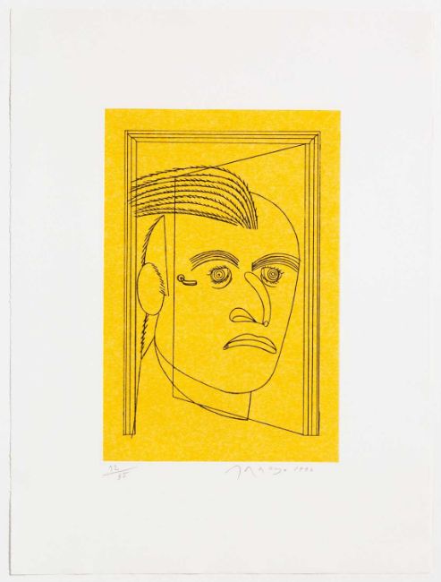 Aquatintaradierung auf gelbem Japan, auf Zerkall-Bütten.