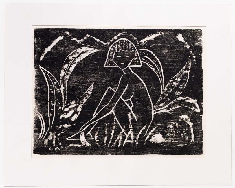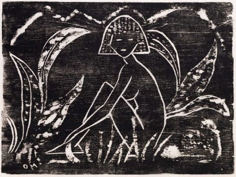 Otto Mueller (1874 Liebau, Schlesien - Obernigk, Niederschlesien 1930) Mädchen zwischen Blattpflanzen (Mädchen im Schilf). 1912/1945/1952. Holzschnitt auf Japanbütten. Posthumer Abzug von Maschka Mueller und ihrem Sohn Eugen Meyerhofer nach 1945. Darstellungsmaß (Blattmaß): 27,8 x 37,5 cm (40,2 x 48,5 cm). Einer von ca. 500 Abzügen WVZ.: Karsch 3/II A. Provenienz:Privatsammlung, Hamburg. Zur Vorbesichtigung in der Lise-Meitner-Str. 7-9, 10589 Berlin.