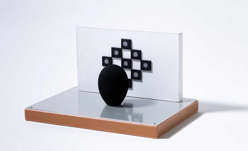 Mehrteilige Skulptur aus Acryl, Acrylglas und Sperrholz. Mit aufliegendem Schaumstoff-Ei.