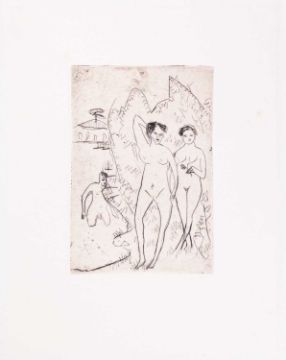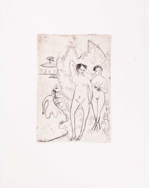 Ernst Ludwig Kirchner (1880 Aschaffenburg - Davos 1938) Badende. 1910. Kaltnadel auf Velin. Nachlassdruck. Stuttgart, Ketterer, 1979 (verso mit dem Stempel). Darstellungsmaß (Blattmaß): 17,3 x 12 cm (30,3 x 24,2 cm). Exemplar 22 von 30 Abzügen. WVZ.: Dube II, 111. Provenienz:Privatsammlung, Hamburg. Zur Vorbesichtigung in der Lise-Meitner-Str. 7-9, 10589 Berlin.