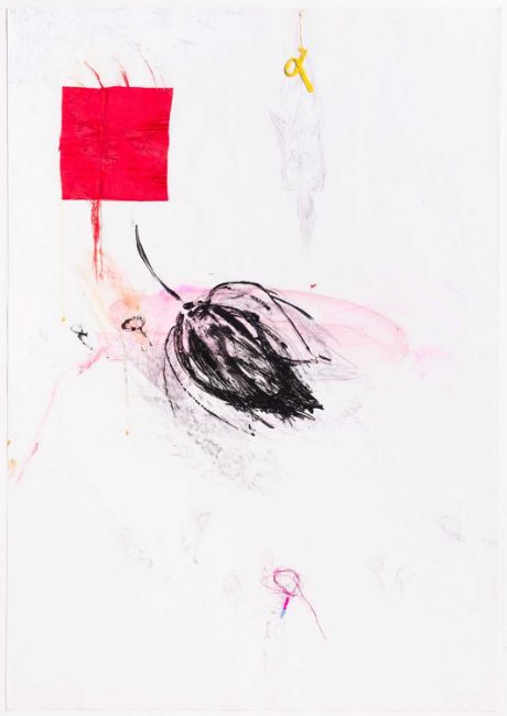 Acryl, Wollfäden, Stoff und Deckweiß auf gestrichenem Papier.