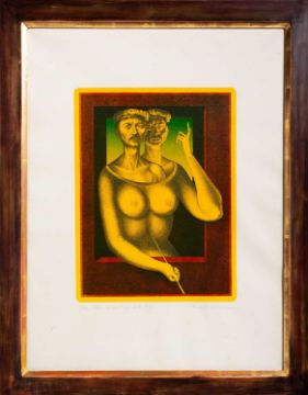 Rudolf Hausner (1914 Wien - Mödling 1995) Adam bei sich. 1969. Farblithografie auf Velin. Unterhalb der Darstellung mit Bleistift signiert, betitelt, datiert und nummeriert: Rudolf Hausner, Adam bei sich, 1969, 7/60. Blattmaß: 66 x 50 cm. Unter Glas gerahmt: 74 x 57,4 cm. Zustand: vereinzelt mit kleinen Fleckchen. Provenienz:Privatsammlung, Hessen. Zur Vorbesichtigung in der Lise-Meitner-Str. 7-9, 10589 Berlin.