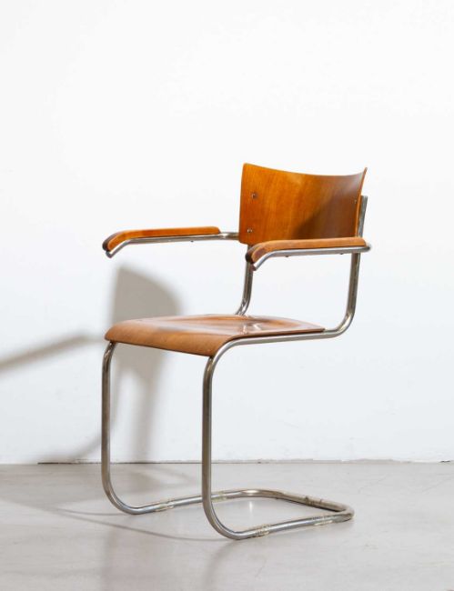 Nach Mart Stam (1899 Purmerend - Goldach 1986) Freischwinger. Holz und Stahlrohr. Hersteller unbekannt. Maße: 80 x 50 x 38 cm. Provenienz:Nachlass Monika Hansen-Sander und Otto Sander, Berlin. Zur Vorbesichtigung in der Lise-Meitner-Str. 7-9, 10589 Berlin.