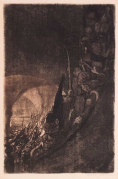 Käthe Kollwitz (1867 Königsberg - Moritzburg 1945) Bewaffnung in einem Gebäude. 1906. Aquatinta auf Bütten. Unten rechts mit Bleistift signiert: Käthe Kollwitz und mit den typografischen Angaben des Druckers: Druck von O. Felsing Berlin SW. Darstellungsmaß (Blattmaß): 48,2 x 31,5 cm (65 x 51,2 cm). WVZ.: Klipstein 95. Zustand: Stark gebräunt. Provenienz:Privatsmallung, Hamburg. Zur Vorbesichtigung in der Lise-Meitner-Str. 7-9, 10589 Berlin.