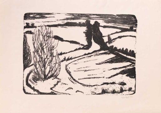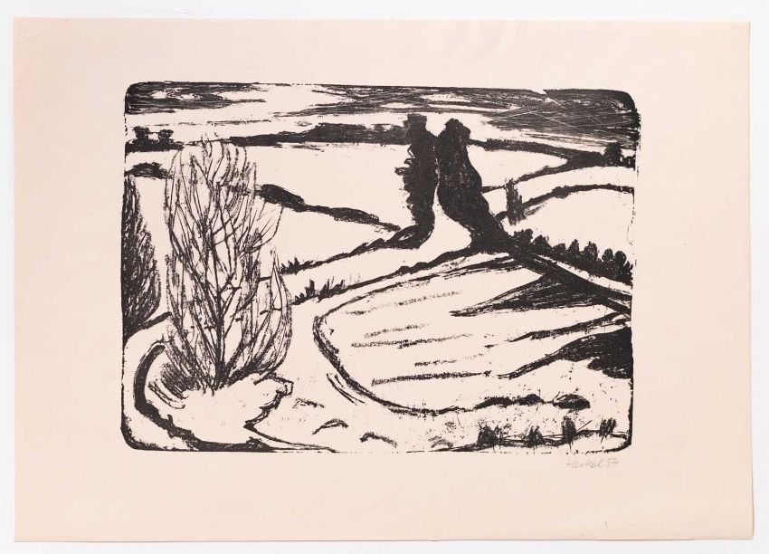 Erich Heckel (1883 Döbeln - Radolfzell am Bodensee 1970) Winter in Angeln. 1954. Lithografie auf Velin. Unterhalb der Darstellung rechts mit Bleistift signiert und datiert: Heckel, 54. Einer von 327 Abzügen. Darstellungsmaß (Blattmaß): 26,4 x 37 cm (37,5 x 53 cm). Hrsg. von: Griffelkunst,Hamburg, 1954. Provenienz:Privatsammlung, Hamburg. Zur Vorbesichtigung in der Lise-Meitner-Str. 7-9, 10589 Berlin.