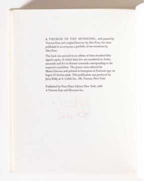 Alex Katz & Vincent Katz A Tremor in the Morning. 1986. Gebundenes Buch mit elf Original-Linolschnitten von Alex Katz sowie zehn Gedichten von Vincent Katz, jeweils auf Ingres D’Arches Papier. Auf der letzten Buchseite mit Bleistift signiert: Alex Katz, Vincent Katz. Aus einer Auflage von 350 Exemplaren. Maße Buch: 23,5 x 19,5 cm. Hrsg. von: Peter Blum Edition, New York. Provenienz:Privatsammlung, Hamburg. Zur Vorbesichtigung in der Lise-Meitner-Str. 7-9, 10589 Berlin.